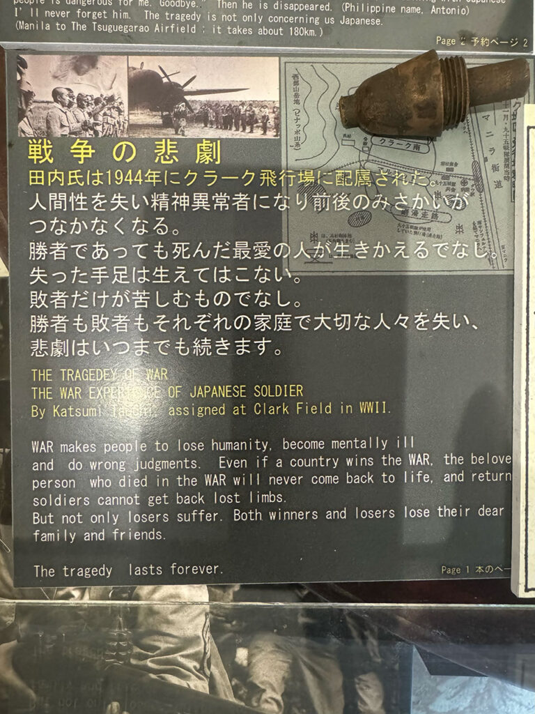 Bambanは戦場だったので、トンネルで見つかった遺品が展示されているけど、遺族から寄付された展示品も多い。戦時中の写真、兵器や遺留品、当時の地図や文書など。