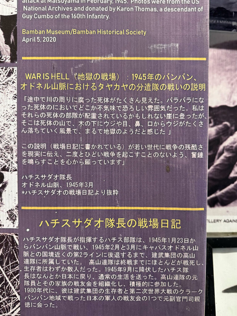 この場所が興味深いのは、米軍・日本軍双方の資料を収集し、太平洋戦争の現場としてのバンバンの重要性を学術的にも観光資源としても伝えようとしていることです。戦争関係の場所はスタンスが現れる。日本はアジア解放のため正しかった。日本は大虐殺をして悪かった。そういう判断はしたくない。コロナでパニックになったように、戦争中に冷静な判断なんてできるとは思えない。平和ボケした今の日本人が戦争中の日本人の行動を評価すること自体ナンセンスと思ってる。ただ、記録を残す。その行動には価値がある。