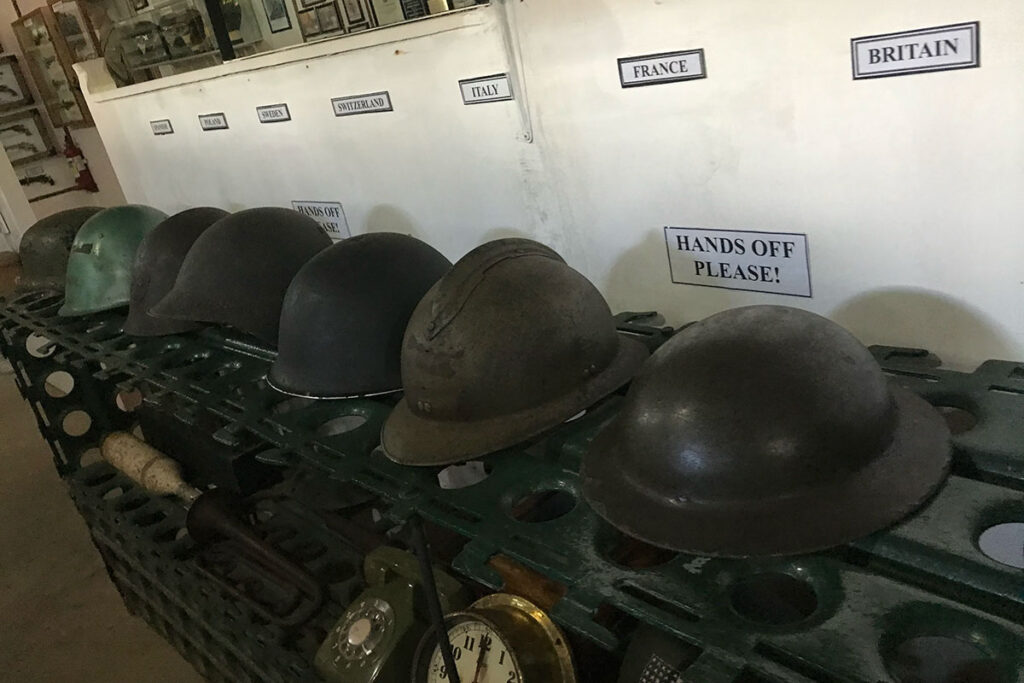 展示内容は幅広いです。当時使われていたジープや軍用車両といった大型展示から、各国の銃火器や弾薬、軍服、さらには当時の紙幣や手紙といった日常品まで、間近で見ることができます。日本軍、アメリカ軍、連合国側それぞれの装備品が比較できるようになっています。